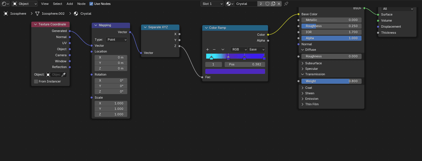 For shading, I developed a custom material using Blender’s Principled BSDF shader, focusing on transparency, subsurface scattering, and refraction. By fine-tuning IOR (Index of Refraction), roughness, and transmission values, I achieved realistic light dispersion within the crystals.