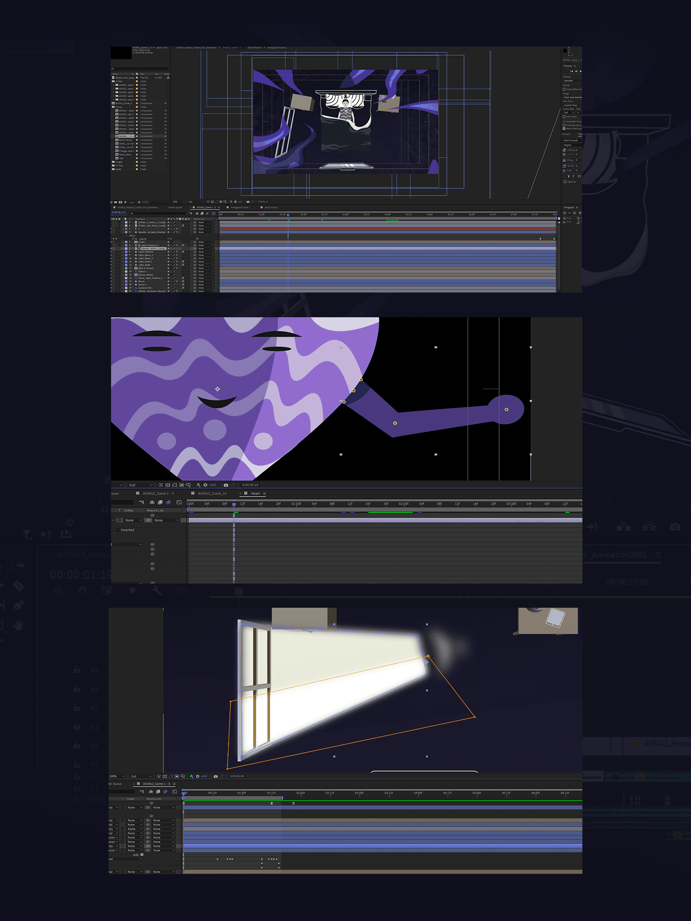 The idea was to disguise these 3D models as 2D assets so that when everything was animated to fall into the “metaphysical abyss” they would match the rest of the Illustrator vectors. I cell shaded these items too as a way of creating a simplistic toon look for each model. Finally, I animated the scale, positional and rotational values of each model so that it would smoothly fall behind the bed in the middle of the shot and disappear.
