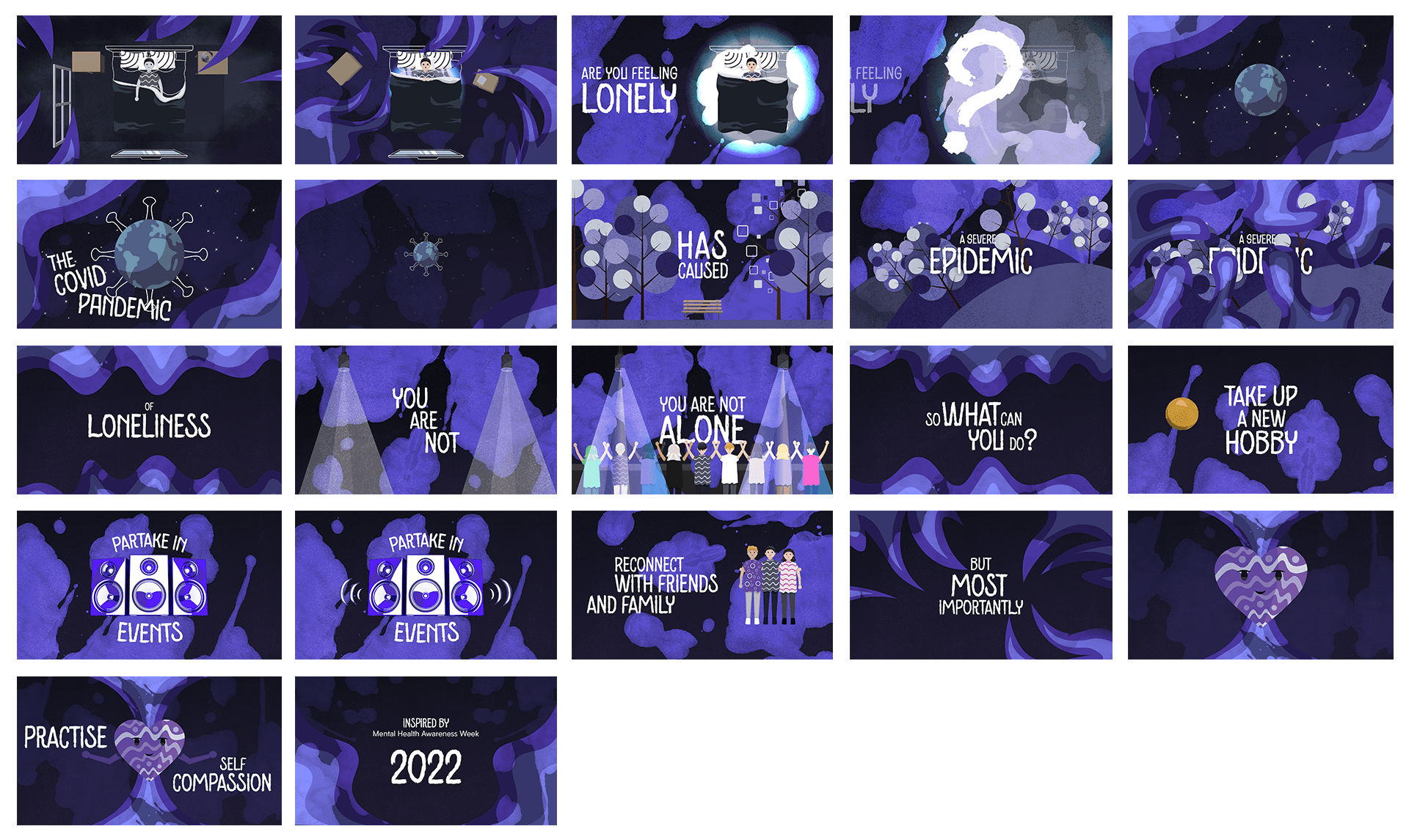 An emotive animation based on Mental Health Awareness Week 2022. It tackles the subject of post-pandemic loneliness and ways to combat these emotional issues.